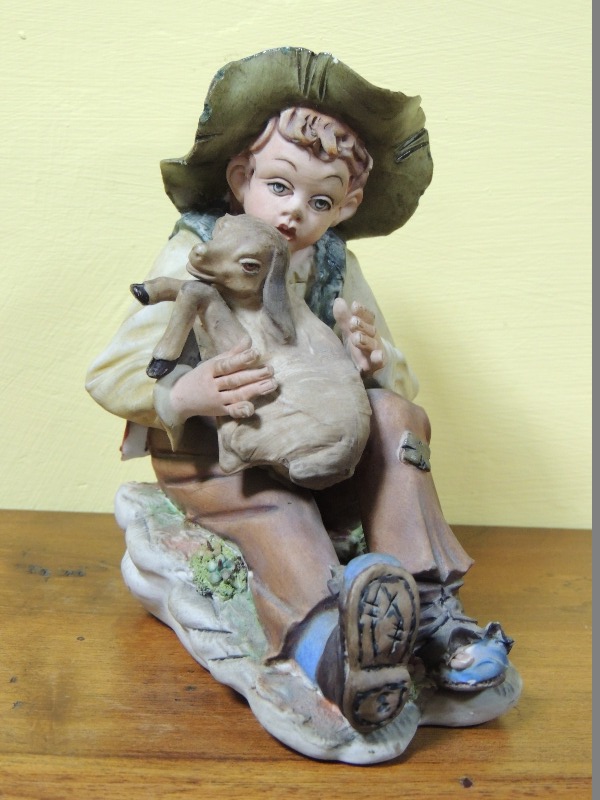 SCULTURA IN PORCELLANA BISCUIT RAFFIGURANTE " PASTORELLO CON PECORA" FIRMATO G.CORTESE. IN BUONE CONDIZIONI.