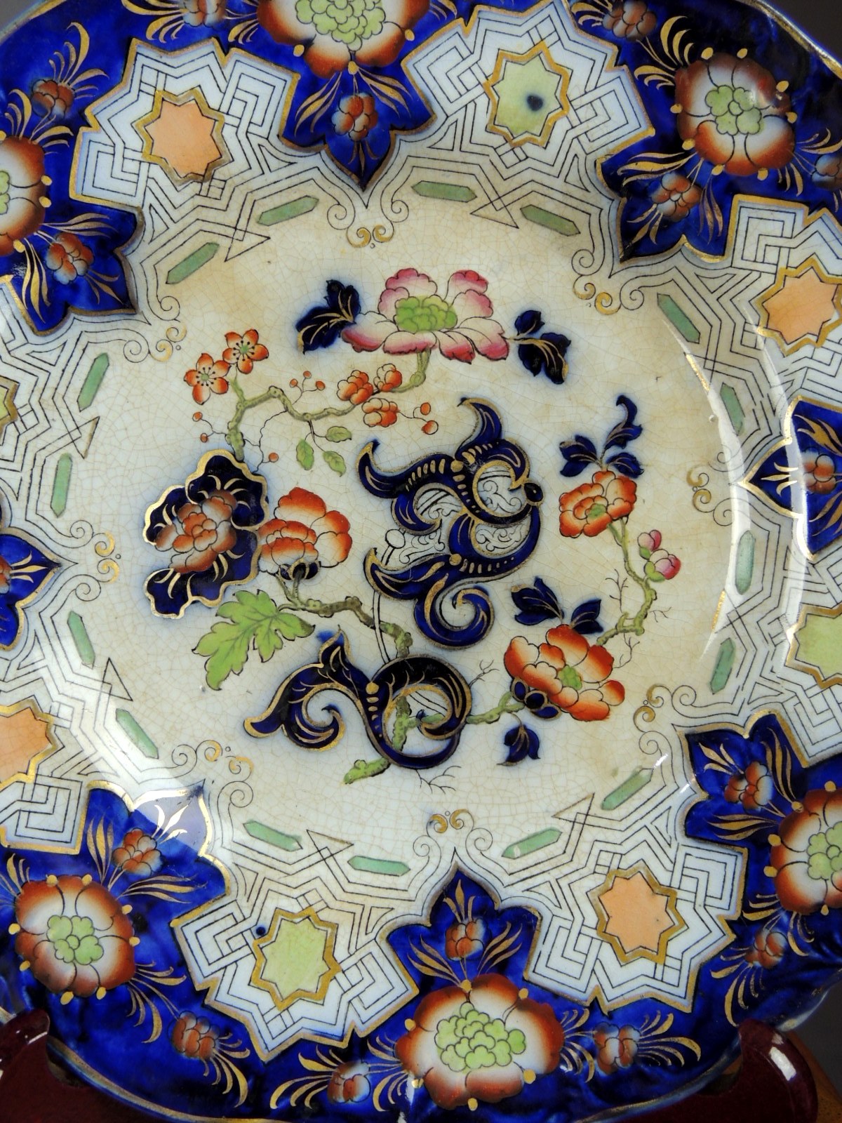 COPPIA PIATTI IN PORCELLANA A BORDO MISTILINEO DECORATI CON MOTIVI GEOMETRICI E FLOREALI .MANIFATTURA ORIENTALE