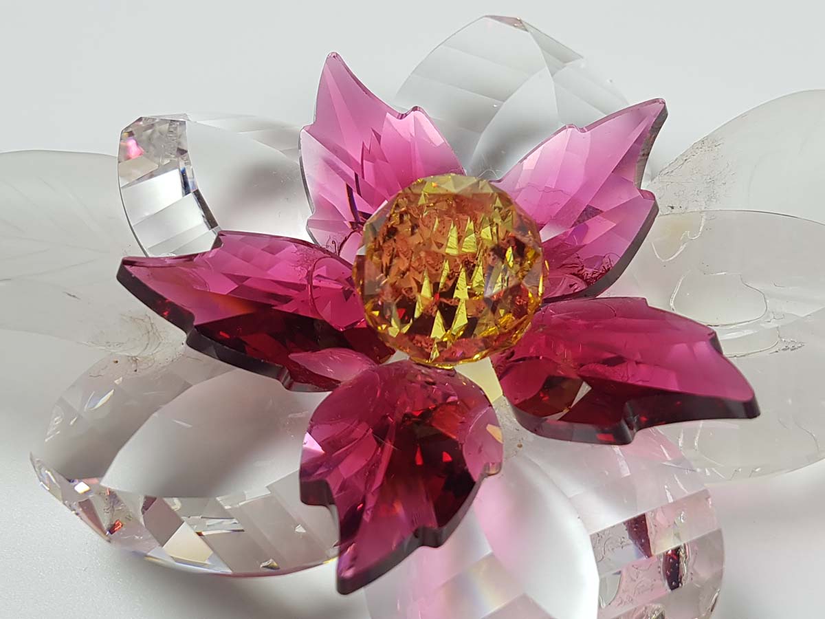 FIORE IN CRISTALLO CON PETALI SATINATI TRASPARENTI E AMETISTA FIRMATI SUL RETRO CON MARCHIO VIENNA. FINE SECOLO XX. IN OTTIME CONDIZIONI.