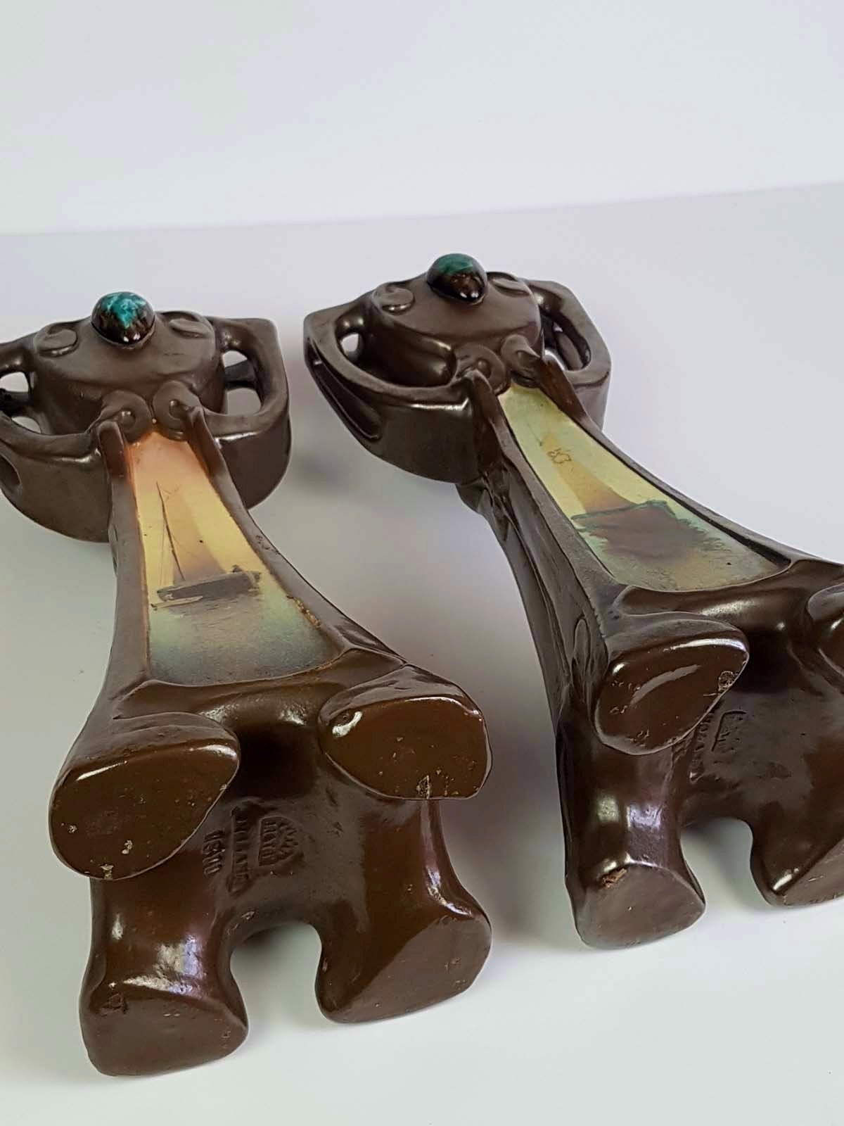 PARTICOLARE COPPIA DI VASI IN MAIOLICA A FONDO PATINATO BRONZO CON RISERVE DIPINTE RAFFIGURANTE " BARCHE A VELA" DISEGNATE DA BRETBY ART POTTERY. MARCATE SUL FONDO BREDBY ENGLAND. EPOCA 1890 - 1919. IN OTTIME CONDIZIONI.