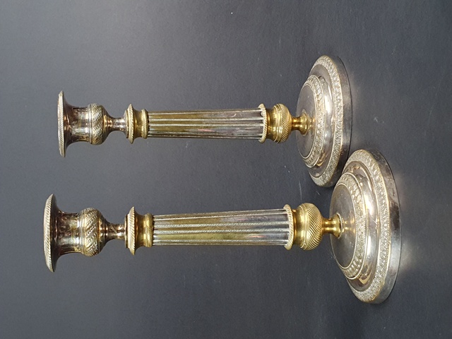 COPPIA CANDELIERI IN BRONZO ARGENTATO CARLO X CON CORPO COSTOLATO SU BASE CIRCOLARE.