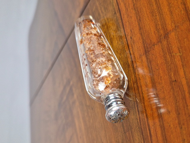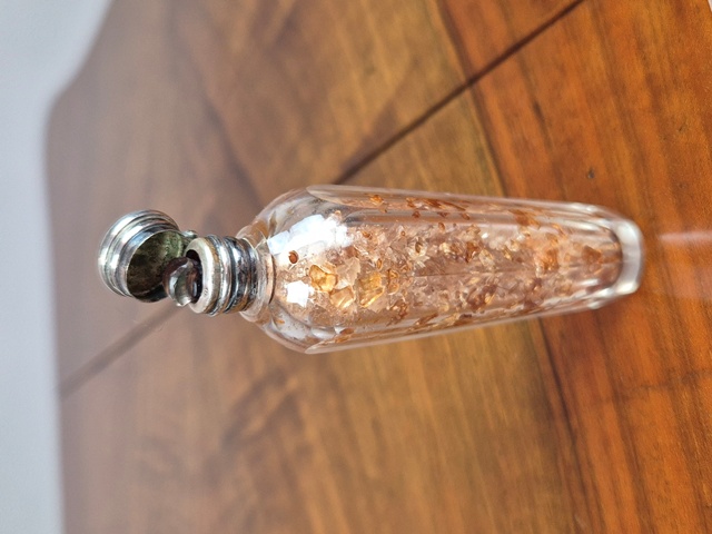 PICCOLA BOTTIGLIA IN CRISTALLO SFACCETTATOCON TAPPO APRIBILE IN ARGENTO.