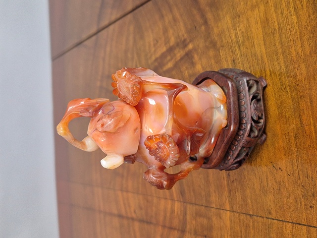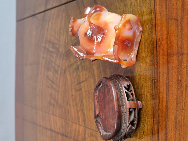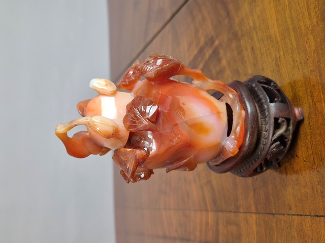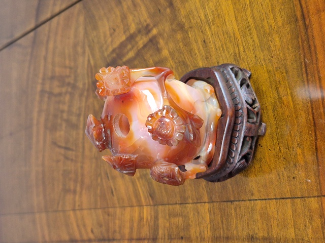 GRAZIOSO PORTA PROFUMO IN AGATA CORNIOLA SCOLPITO A MOTIVI VEGETALI E DI FIORI,POGGIANTE SU BASE IN LEGNO.
