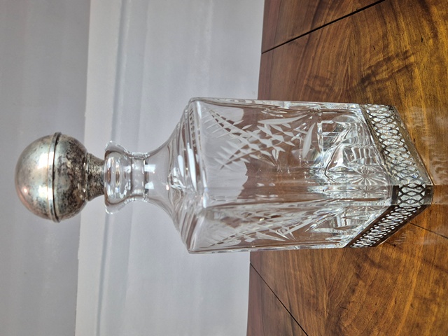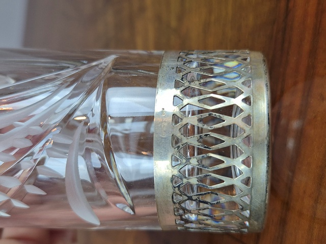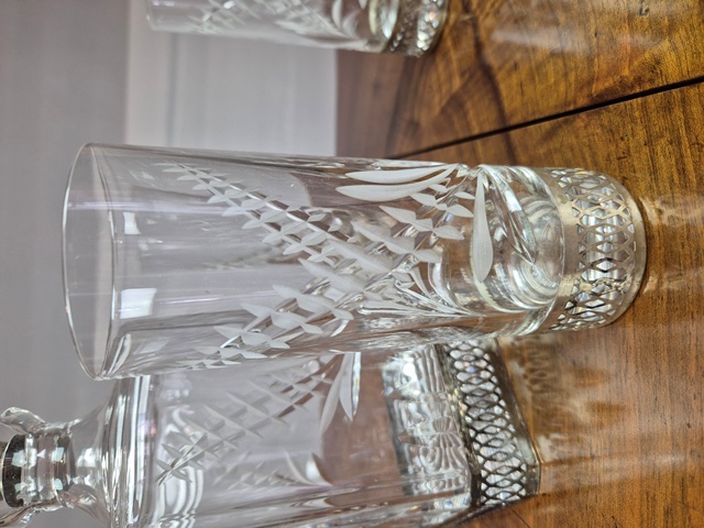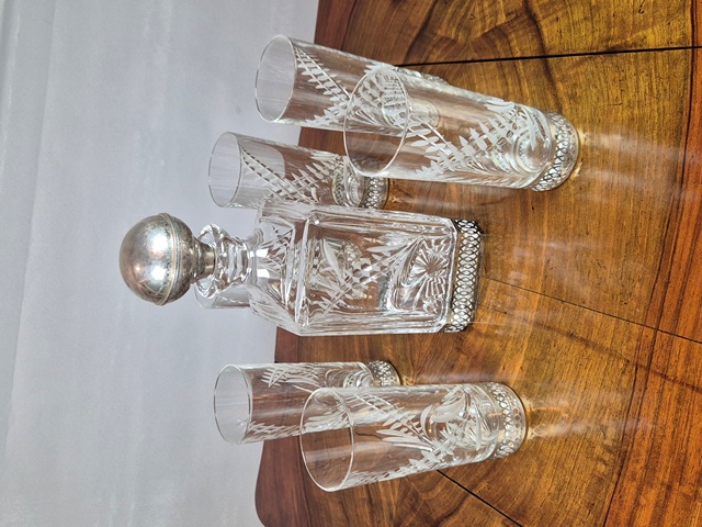 SERVIZIO IN CRISTALLO SEI BICCHIERI ED UNA BOTTIGLIA,LAVORATO A MOTIVI VEGETALI CON TAPPO ED APPLICAZIONI IN ARGENTO 800.