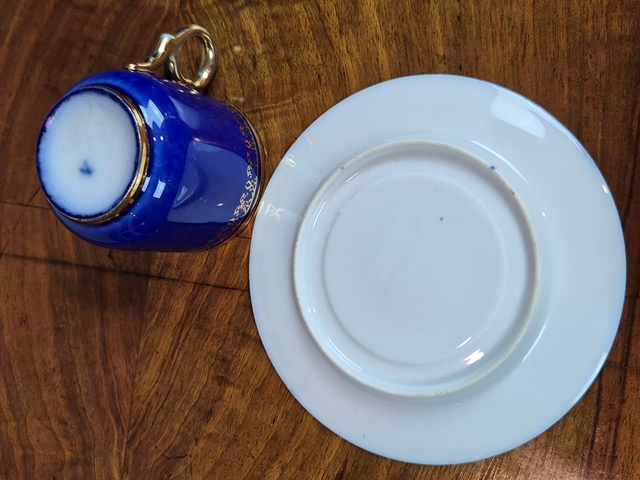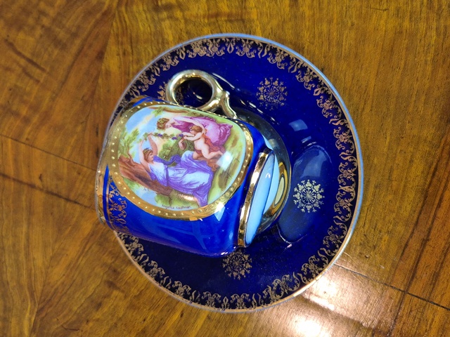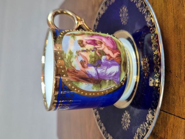 GRAZIOSA TAZZA CON PIATTINO A FONDO BLU COBALTO CON DECORAZIONI IN ORO ZECCHINO,TONDO CENTRALE RAFFIGURANTE SCENA NEOCLASSICA CON ISCRIZIONE ANGELICA KAUFFMAN,MARCHIO IN BLU SUL FONDO DELLA TAZZA.