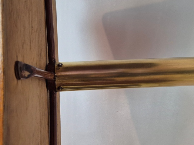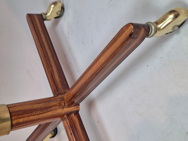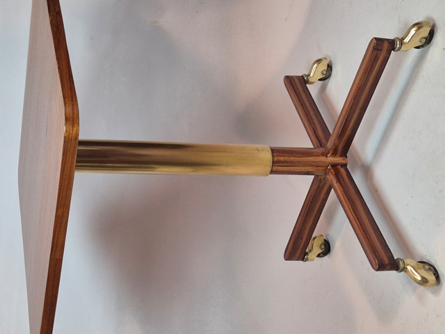 TAVOLO CON PIANO IN LEGNO IMPIALLACCIATO,GIREVOLE SU COLONNA IN OTTONE E BASE A QUATTRO APPOGGI CON ROTELLE IN FERRO LACCATO.