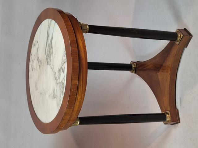 COPPIA TAVOLI DI FORMA ROTONDA IN LEGNO DI CILIEGIO CON PIANO IN MARMO DI CARRARA,TRE SOSTEGNI A COLONNA EBANIZZATA CON CAPITELLI IN BRONZO DORATO E BASE TRIPODE.