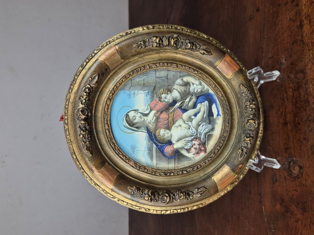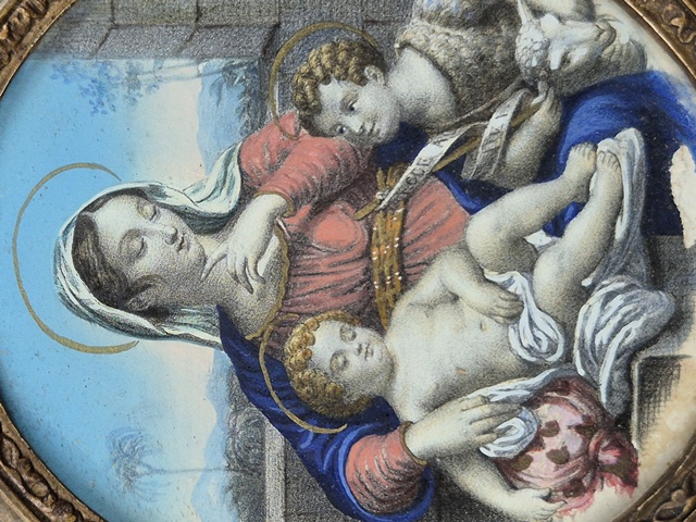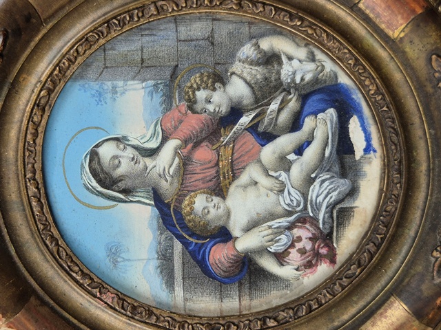 LITOGRAFIA ACQUERELLATA RAFFIGURANTE MADONNA CON BAMBINO E SAN GIOVANNINO,IN ANTICA CORNICE LEGNO E STUCCO.
