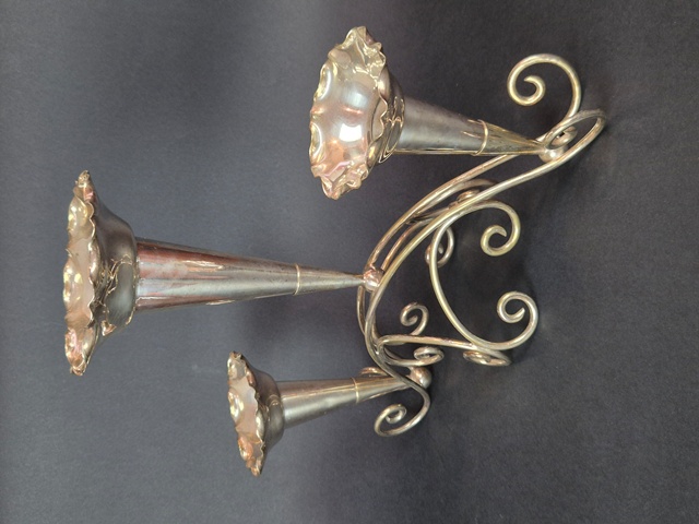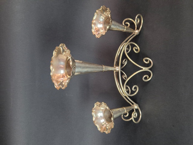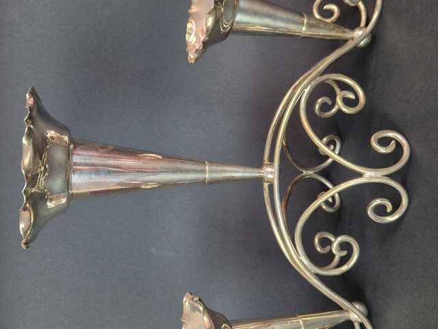 ANTICO CENTROTAVOLA CON STRUTTURA IN METALLO ARGENTATO A TRE VASI REMOVIBILI,LAVORATO A MOTIVI DI VOLUTE.