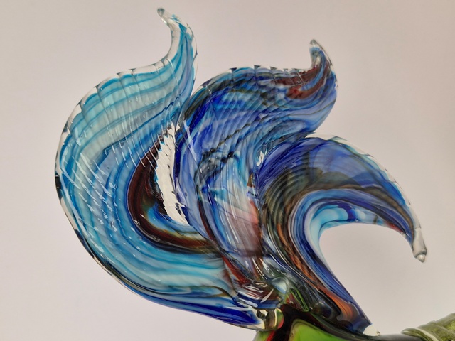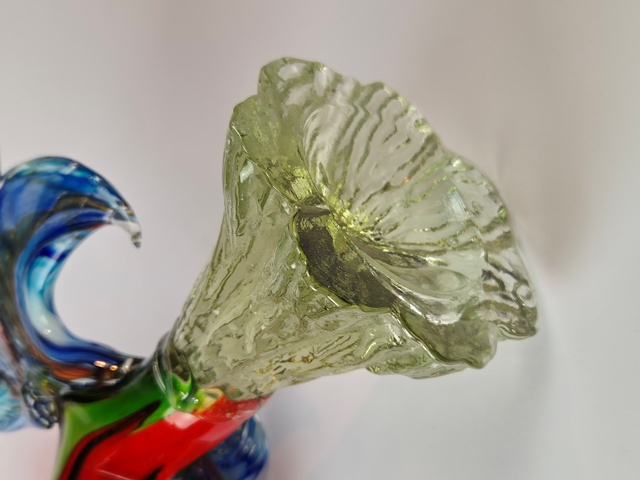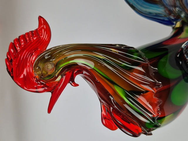 GRANDE E PARTICOLARE SCULTURA IN VETRO DI MURANO RAFFIGURANTE GALLO IN VETRO POLICROMO A COLORI VIVACI.