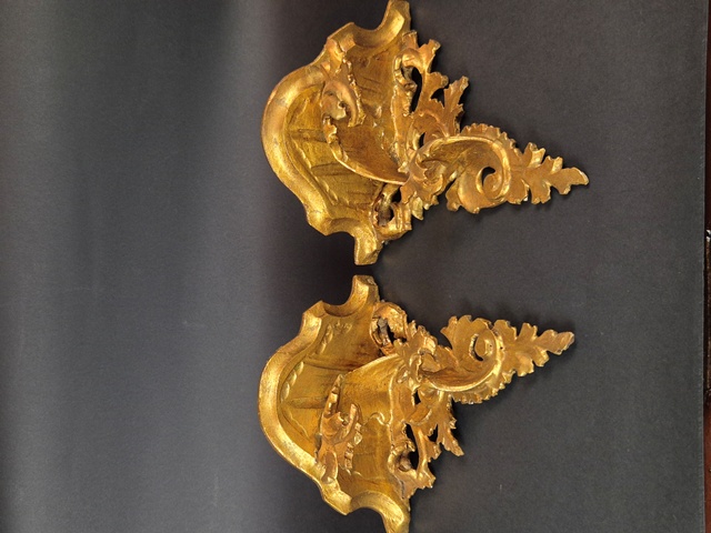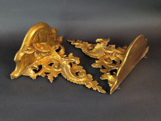 GRAZIOSA COPPIA DI MENSOLE IN LEGNO INTAGLIATO E DORATO.