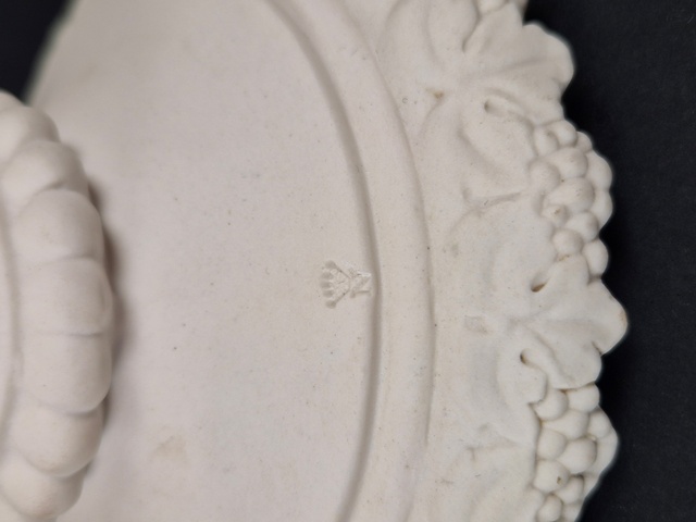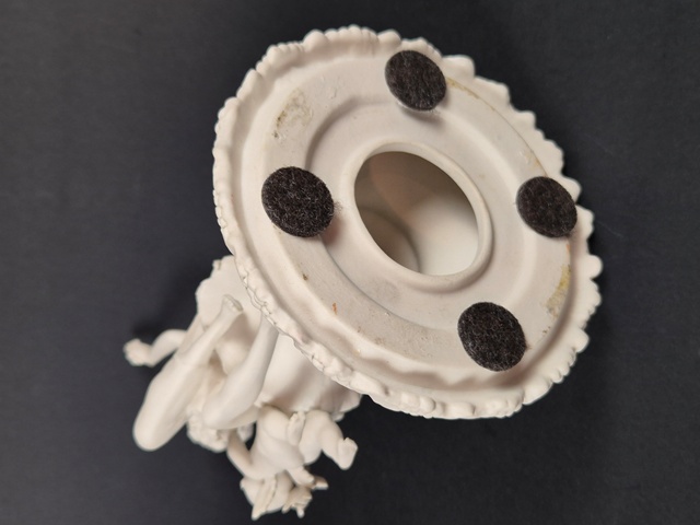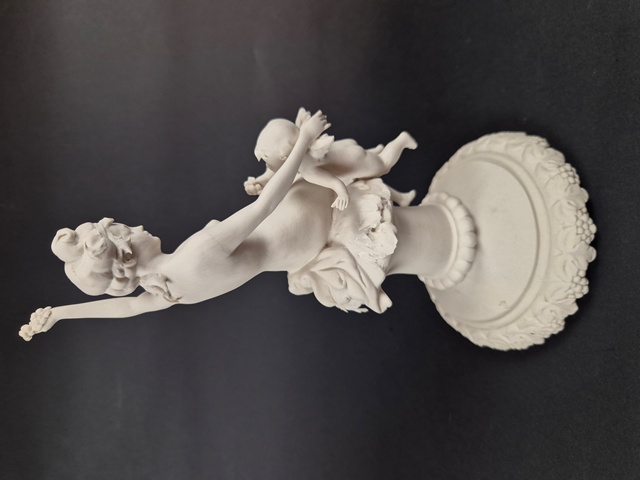 SCULTURA IN PORCELLANA BISCUIT RAFFIGURANTE VENERE CON PUTTO SU PIEDISTALLO LAVORATO A MOTIVI VEGETALI,FIRMATO CON "N" CORONATA INCISA.