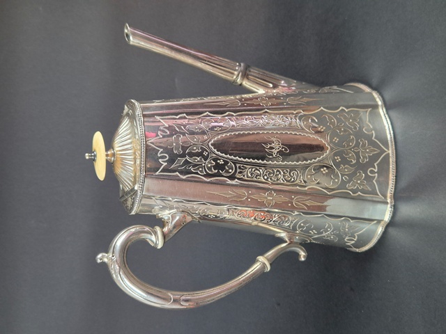 ANTICA CAFFETTIERA IN SHEFFIELD CESELLATA A MOTIVI VEGETALI DI GHIRLANDE E FESTONI,APERTURA SUPERIORE E PRESA LATERALE.