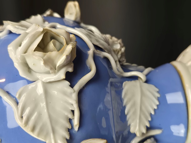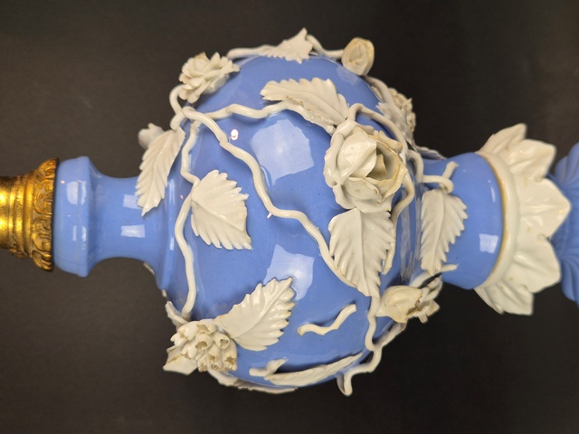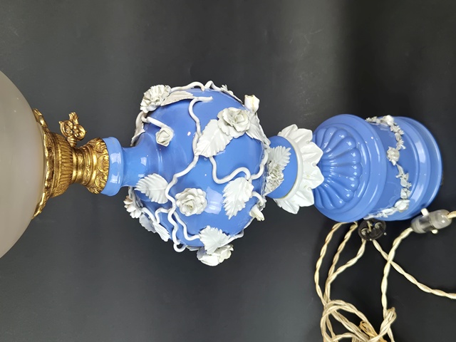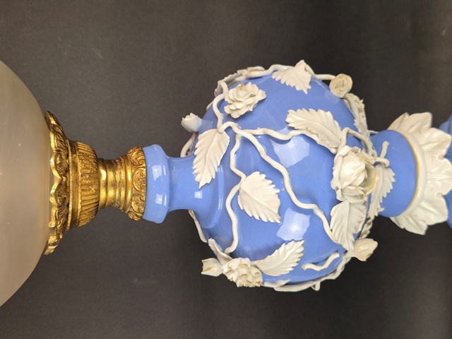 GRANDE LAMPADA IN PORCELLANA A FONDO CELESTE LAVORATA A RILIEVO A MOTIVI VEGETALI E DI FIORI CON APPLICAZIONI IN BRONZO DORATO,BOBECHE IN VETRO MOLATO E MARCATA SUL FONDO CON "N" CORONATA.