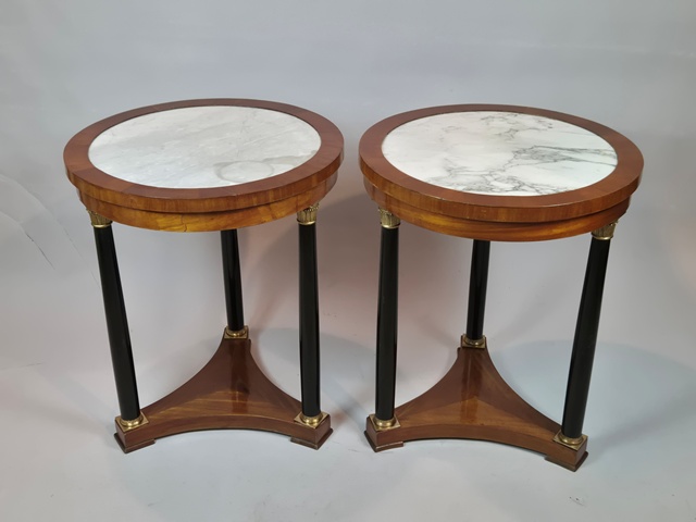 ANTICA COPPIA TAVOLI IMPERO SEC.XIXdisponibile COPPIA TAVOLI DI FORMA ROTONDA IN LEGNO DI CILIEGIO CON PIANO IN MARMO DI CARRARA,TRE SOSTEGNI A COLONNA EBANIZZATA CON CAPITELLI IN BRONZO DORATO E BASE TRIPODE. EPOCA SEC.XIX ALTEZZA:74 CM DIAMETRO:60 CM IN BUONE CONDIZIONI CON LIEVI SEGNI DEL TEMPO PASSATO. € 1600,00 |