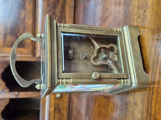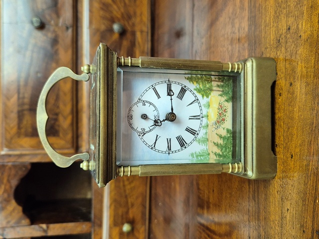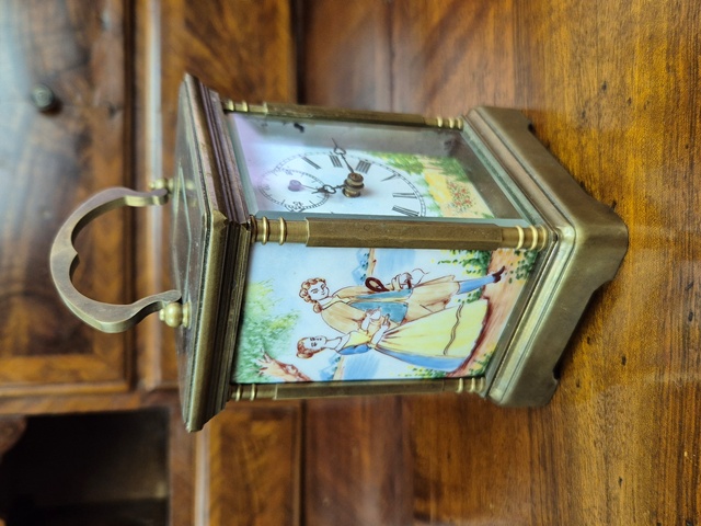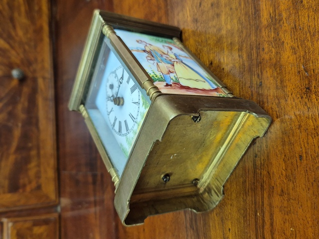 OROLOGIO DA TAVOLO CON QUADRANTE E LATERALI IN SMALTI DIPINTI,PARTE POSTERIORE CON LETTERE INCISE "G" ED "F" COMPLETO PER LA RICARICA FUNZIONANTE IN OTTIME CONDIZIONI.