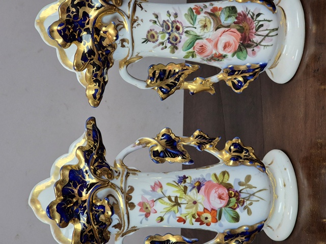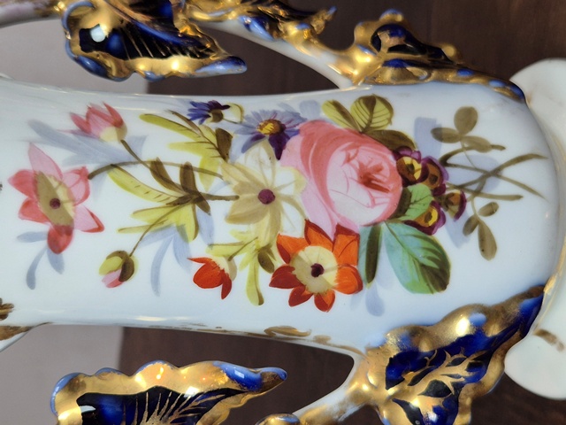 COPPIA DI VASI IN PORCELLANA LAVORATI CON TRALCI DI EDERA DIPINTI IN BLU COBALTO ED ORO ZECCHINO,CENTRALE DIPINTO A MOTIVI FLOREALI.