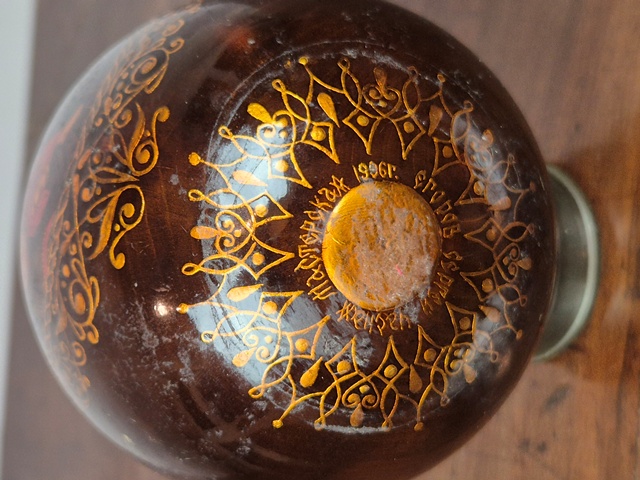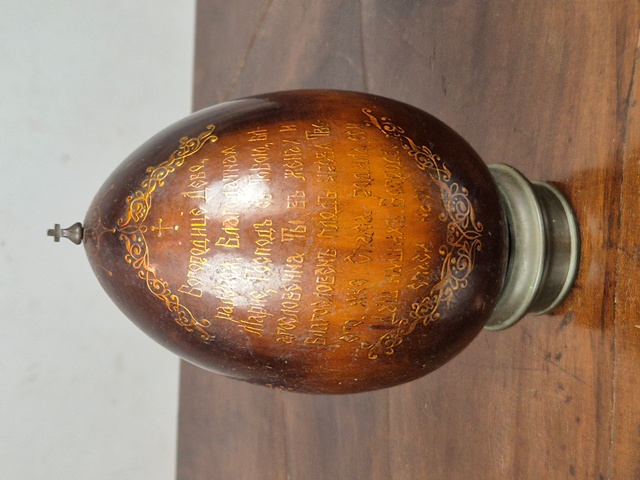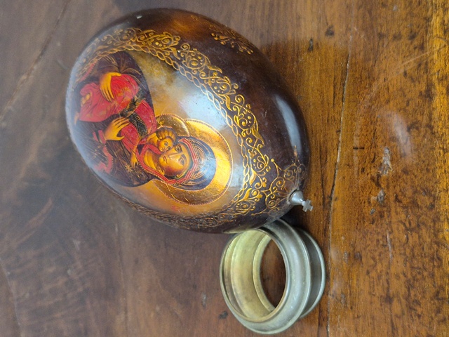 UOVO IN LEGNO DECORATO IN ORO E DIPINTO,RAFFIGURANTE MADONNA CON BAMBINO SU BASE IN OTTONE.
