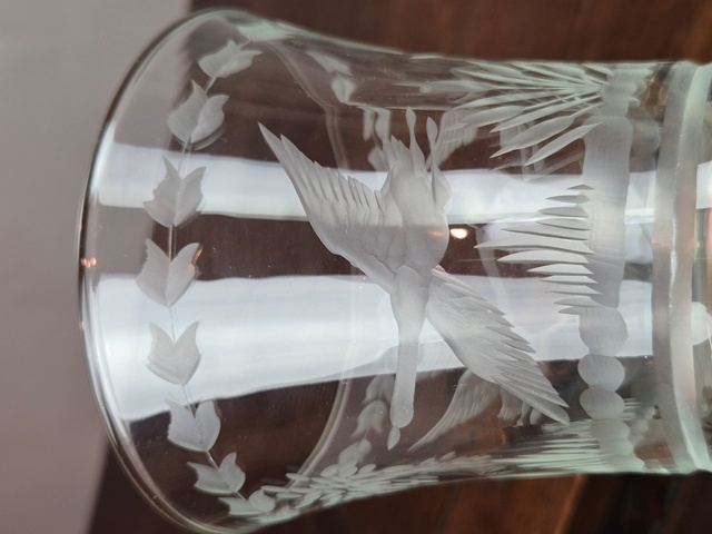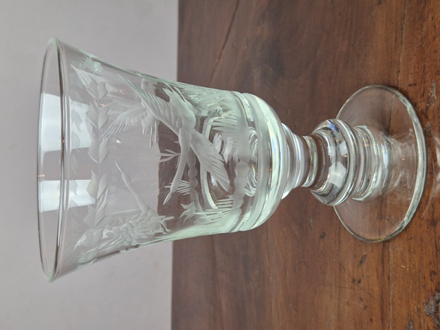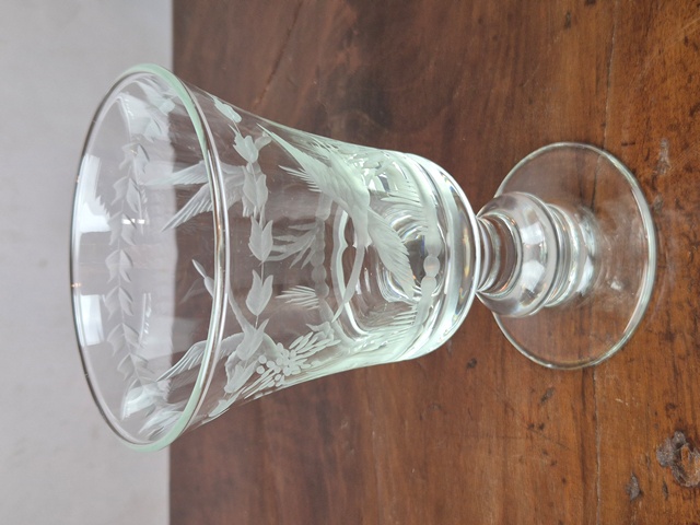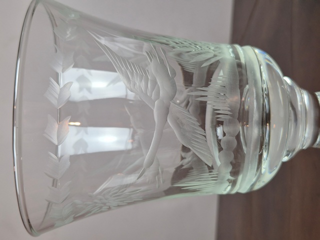 GRANDE CALICE IN CRISTALLO LAVORATO A MOTIVI VEGETALI E DI UCCELLI.