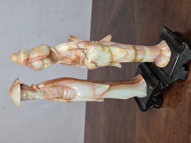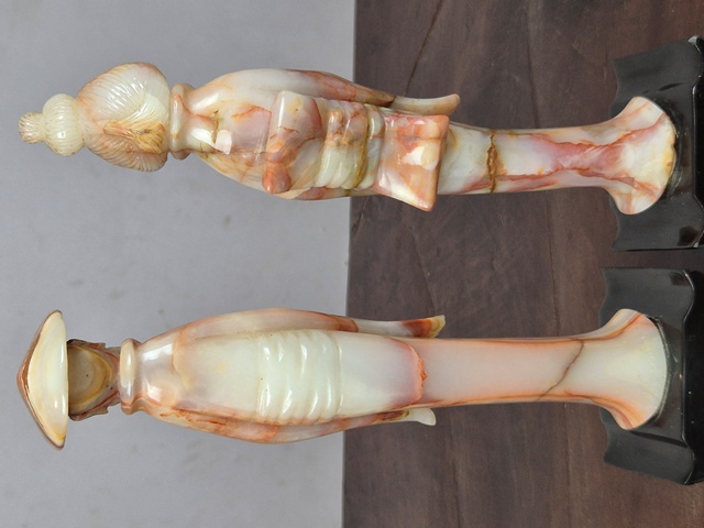 COPPIA SCULTURE IN ONICE RAFFIGURANTI PERSONAGGI ORIENTALI,SU BASI IN ONICE NERO.