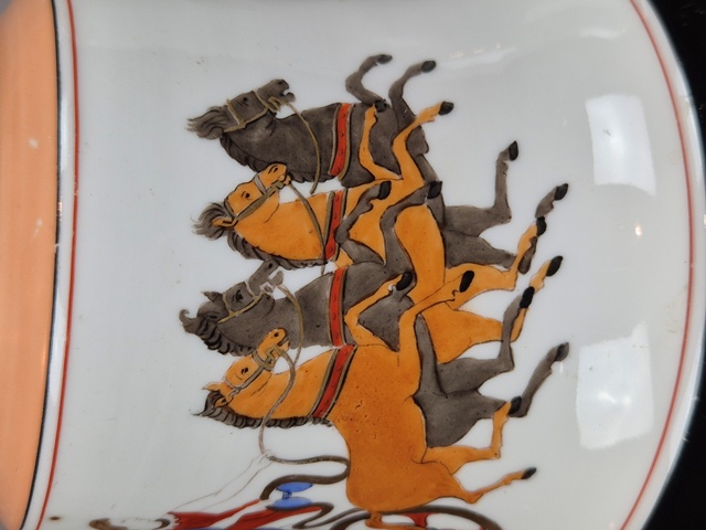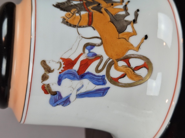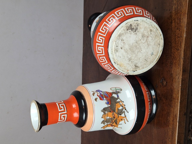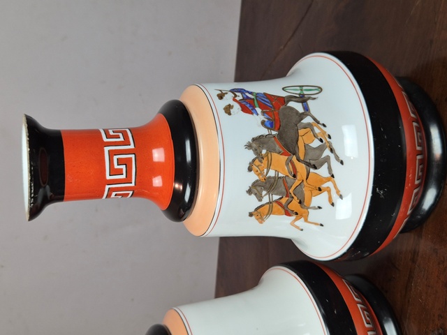 COPPIA DI VASI IN PORCELLANA DECORATI A MOTIVI DI GRECHE,CARRI E CAVALLI.