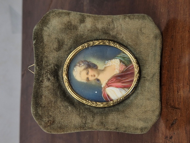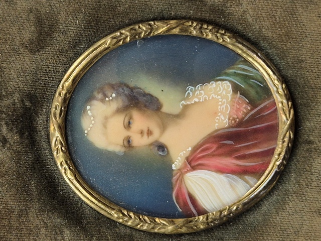 MINIATURA DIPINTA RAFFIGURANTE GENTILDONNA CORNICE IN METALLO DORATO E VELLUTO.