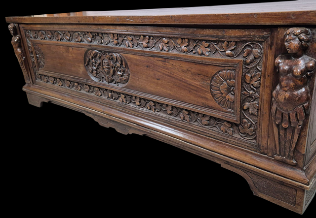 CASSAPANCA IN LEGNO DI NOCE CON FRONTALE INTAGLIATO A MOTIVI VEGETALI,STEMMA CENTRALE E CARIATIDE LATERALE.