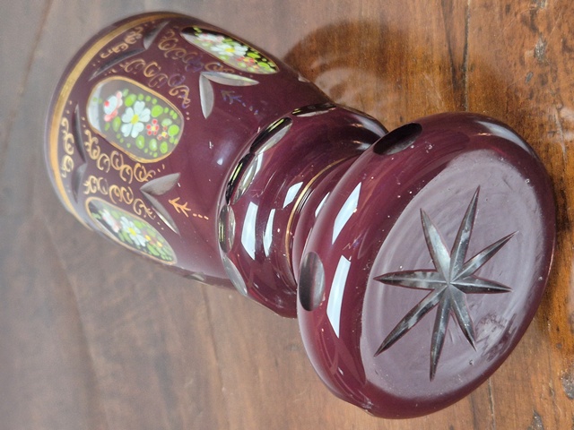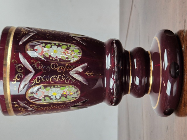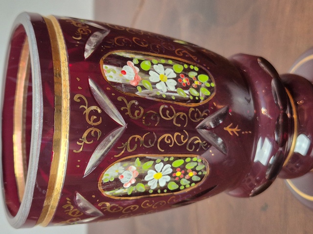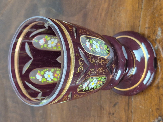 CALICE IN CRISTALLO A FONDO ROSSO RUBINO DECORATO A MOTIVI FLOREALI.