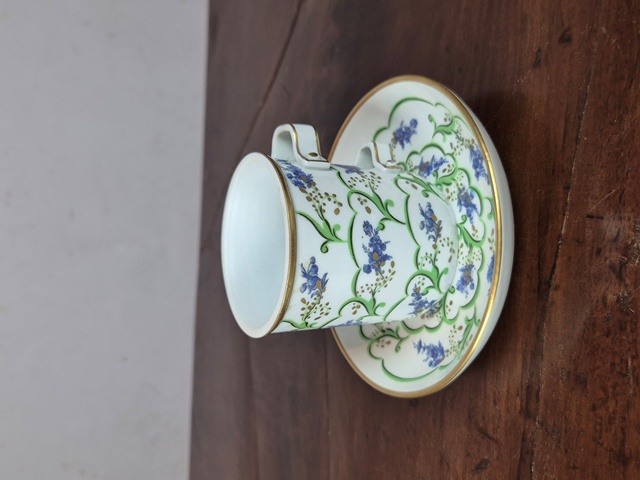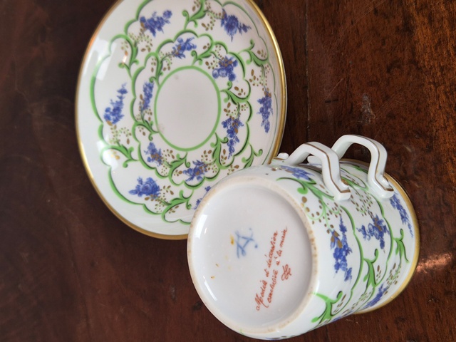 GRAZIOSA TAZZA CON PIATTINO IN PORCELLANA CON APPOSITI INCASTRI LATERALI PER IL CUCCHIAINO,DECORATA IN ORO E DIPINTA A MOTIVI FLOREALI.