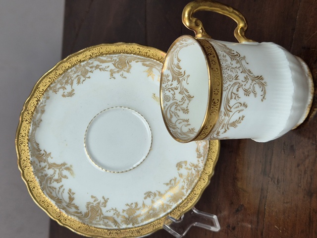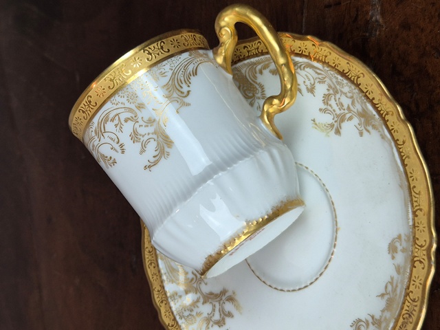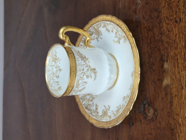 TAZZINA CON PIATTINO IN PORCELLANA DIPINTA E DECORATA IN ORO ZECCHINO.
