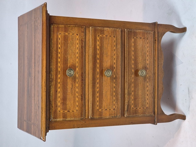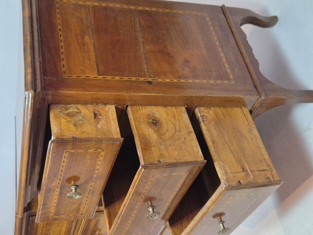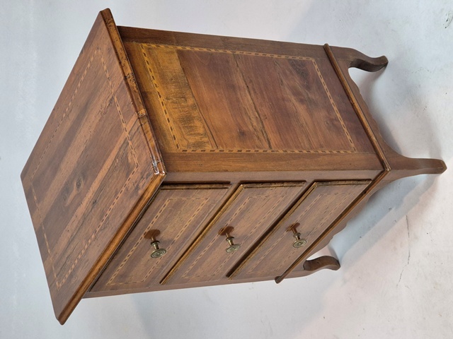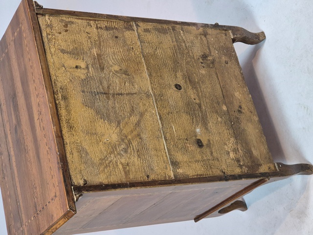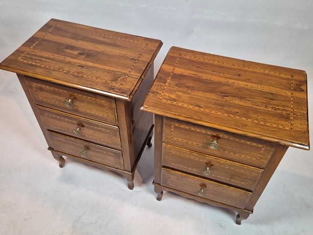 ANTICA COPPIA DI COMODINI IN LEGNO MASSELLO DI NOCE A TRE CASSETTI CON INTARSI A FILETTO IN LEGNI PREGIATI E QUATTRO GAMBE MOSSE IN STILE LUIGI XV.