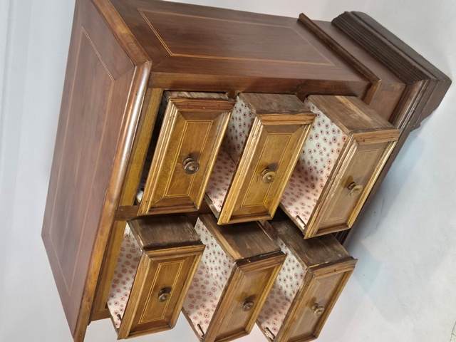 ANTICA CASSETTIERA IN LEGNO DI NOCE CON INTARSI A FILETTO IN LEGNO DI BOSSO,SEI CASSETTI CON POSSIBILITA' DI APRIRE LA PARTE FRONTALE.