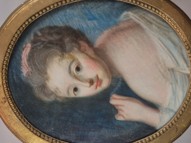 ANTICO ED ELEGANTE RITRATTO A PASTELLO SU PERGAMENA RAFFIGURANTE GIOVANE FANCIULLA CON FIOCCO ROSA.