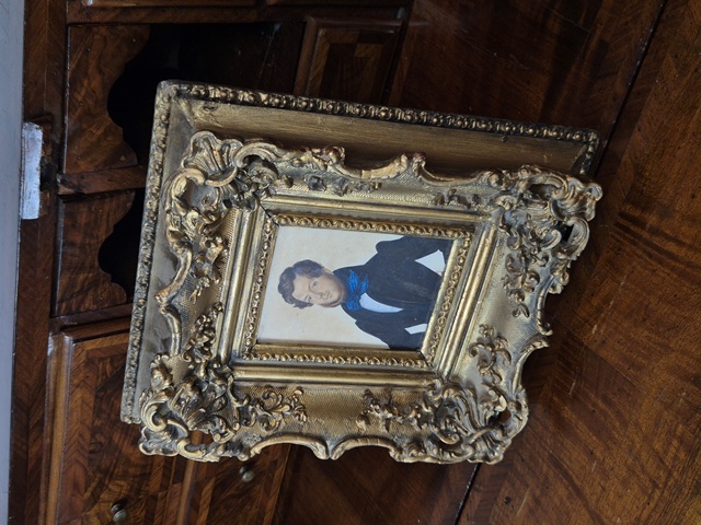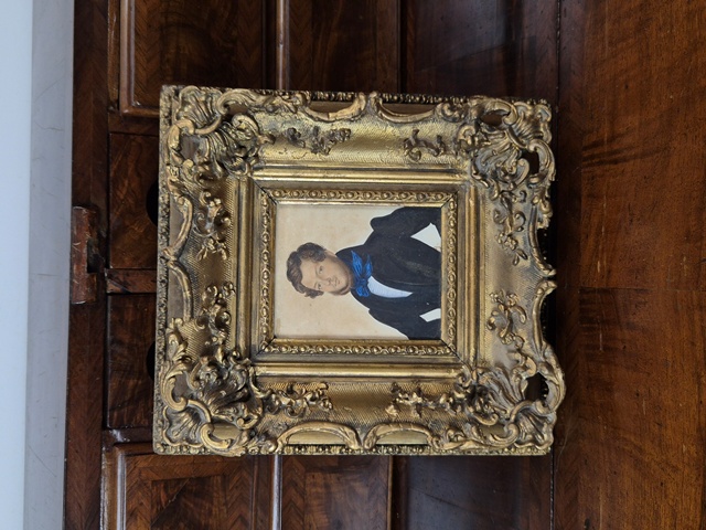 ACQUERELLO RAFFIGURANTE GENTILUOMO CON CORNICE IN LEGNO DORATO E STUCCO.