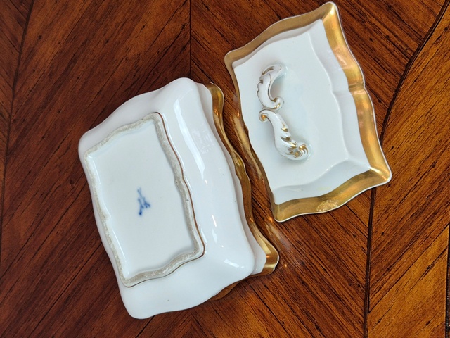 SCATOLA CON COPERCHIO IN PORCELLANA CON RIFINITURE IN ORO ZECCHINO E PRESA DEL COPERCHIO A MOTIVI VEGETALI,MARCATA SUL FONDO MAISSEN(SPADE BLU INCROCIATE.