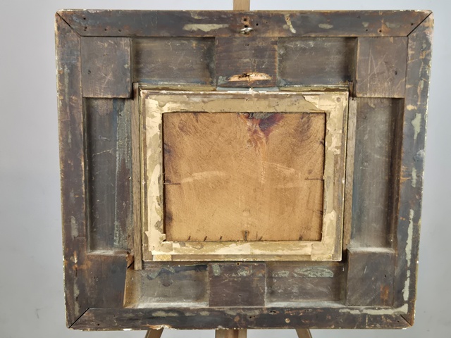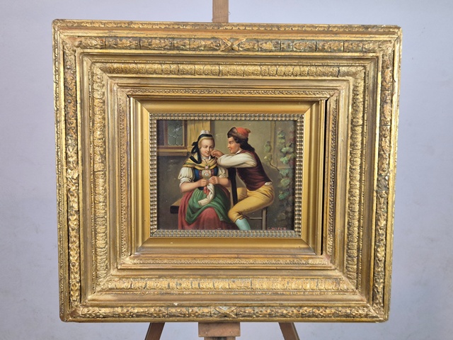 DIPINTO OLIO SU METALLO RAFFIGURANTE CORTEGGIAMENTO,CORNICE IN LEGNO E STUCCO DORATO,FIRMATO IN BASSO A DESTRA C.HOFER