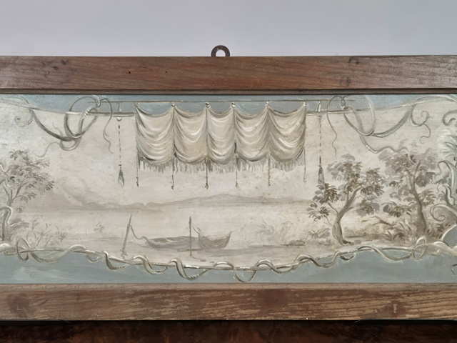 DIPINTO SU TAVOLA RAFFIGURANTE PAESAGGIO LACUSTRE CON BARCA E TRALCI FLOREALI.