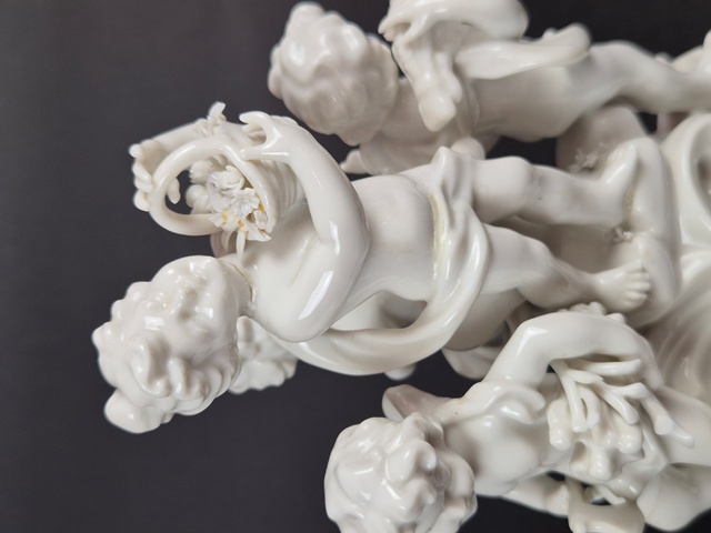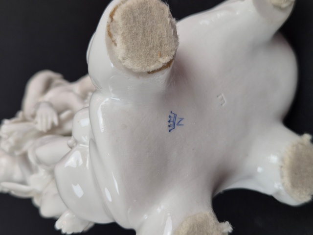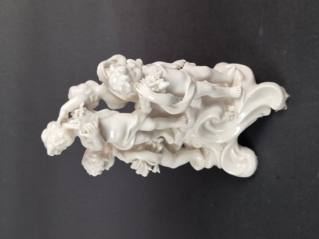 GRAZIOSO GRUPPO SCULTOREO A FONDO BIANCO RAFFIGURANTE PUTTI IN POSE QUOTIDIANE,MARCATO SUL FONDO CON "N" CORONATA IN BLU.