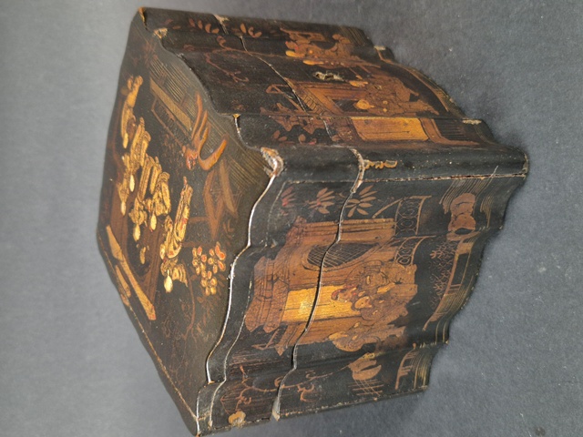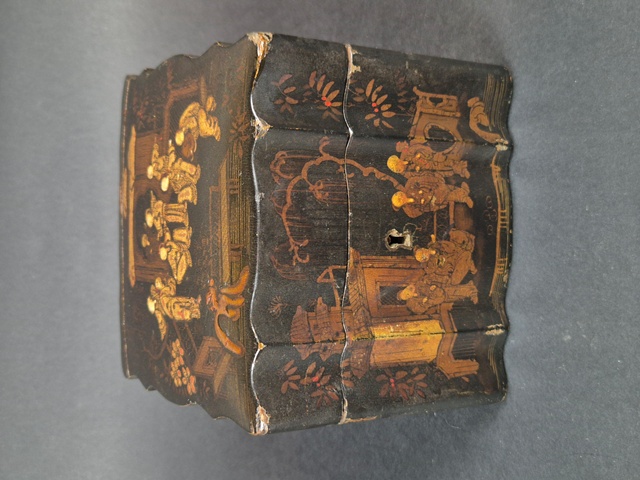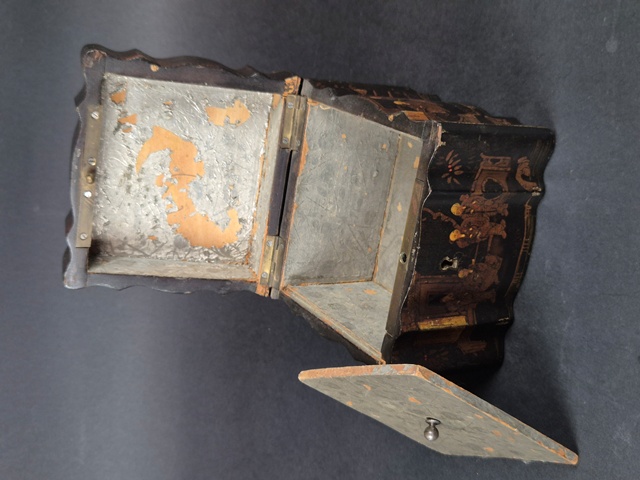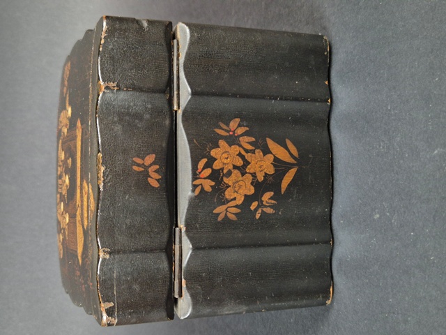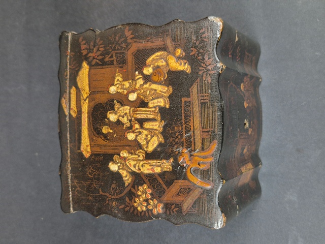 ANTICA SCATOLA PORTA TE' IN LEGNO LACCATO E DIPINTO A MOTIVI DI SCENE DI VITA QUOTIDIANA.