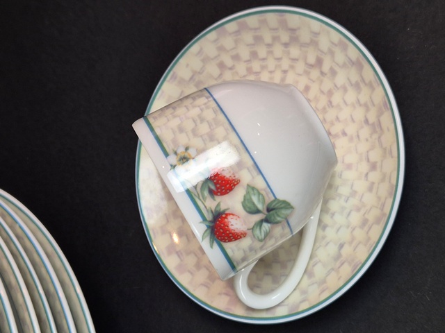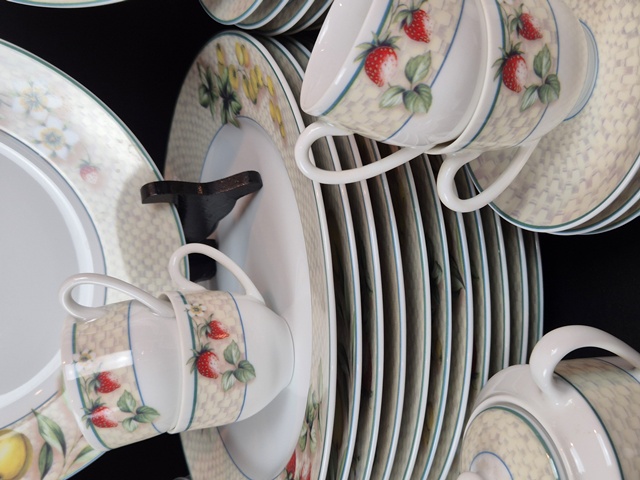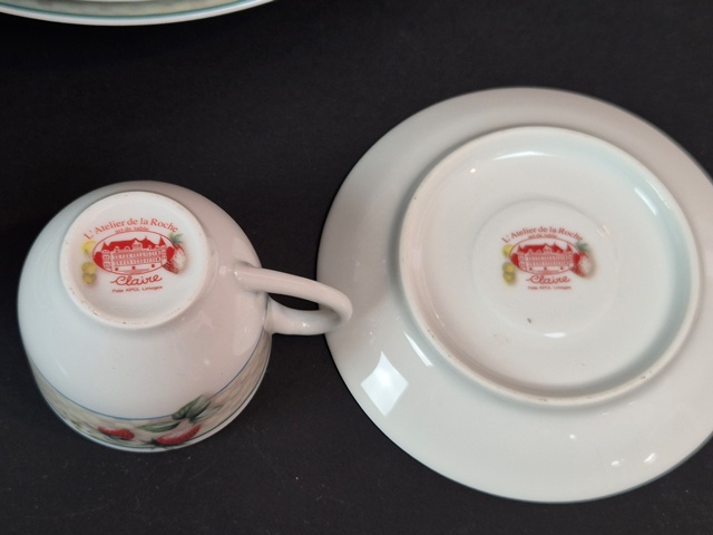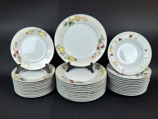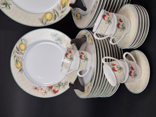 SERVIZIO PIATTI IN PORCELLANA LIMOGES 36 PEZZI PIU 25 PEZZI SERVIZIO DA CAFFE',DECORATO A MOTIVI VEGETALI DI FIORI,LIMONI E FRAGOLE.