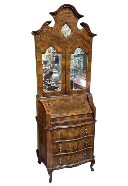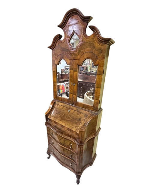 GRAZIOSO PICCOLO TRUMEAU IN NOCE E RADICA DI NOCE CON INTARSI A FILETTO IN LEGNO DI BOSSO,PARTE SUPERIORE CON DUE SPORTELLI A SPECCHIO CON ALL'INTERNO TRE CASSETTI E PIU' SCOMPARTI A GIORNO.