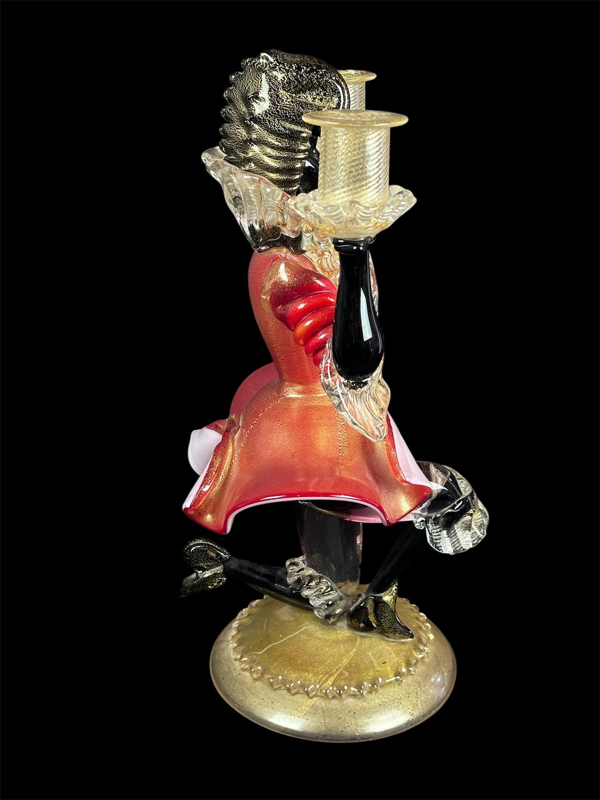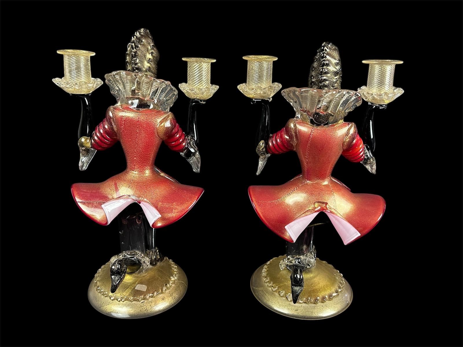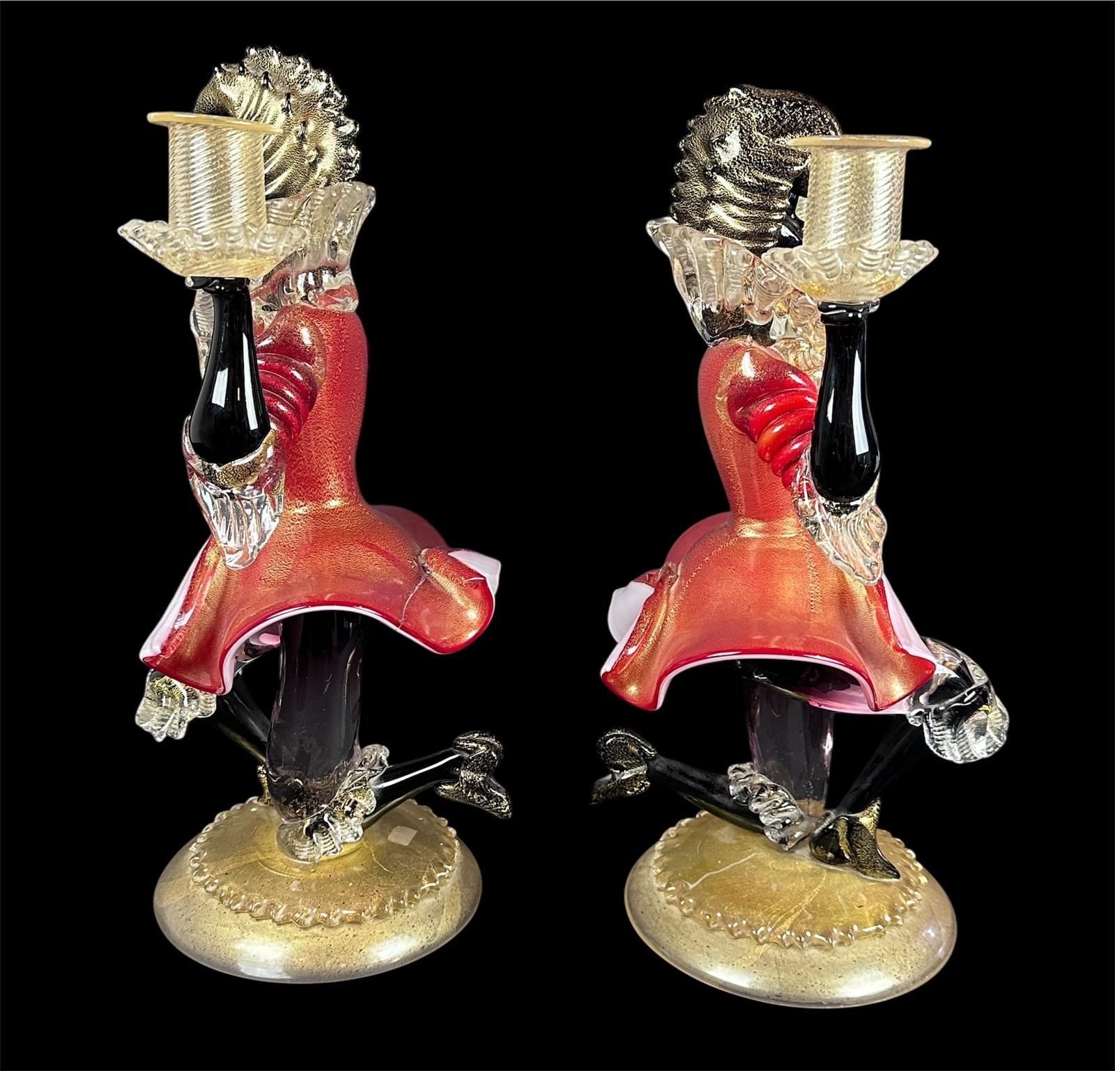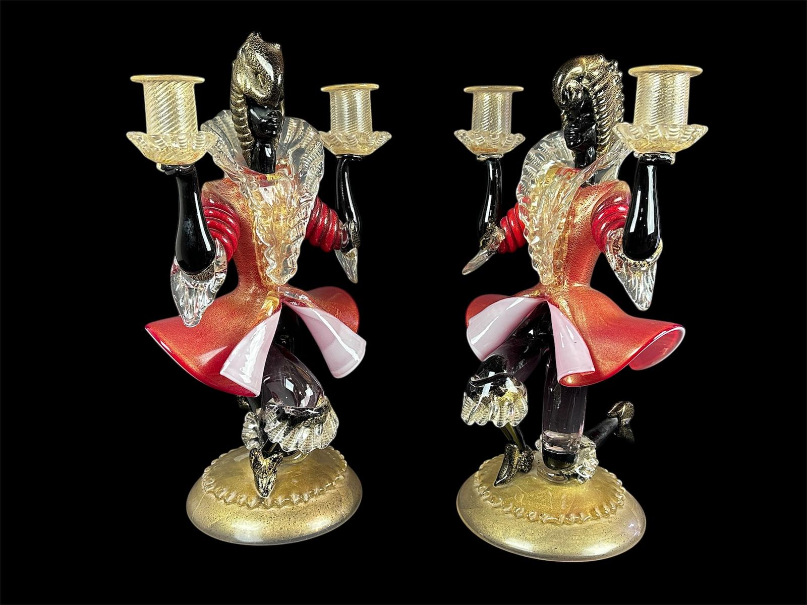 COPPIA DI CANDELIERI IN VETRO DI MURANO RAFFIGURANTI MORI VENEZIANI CON INCLUSIONI IN ORO ZECCHINO.