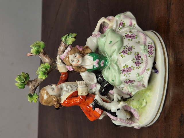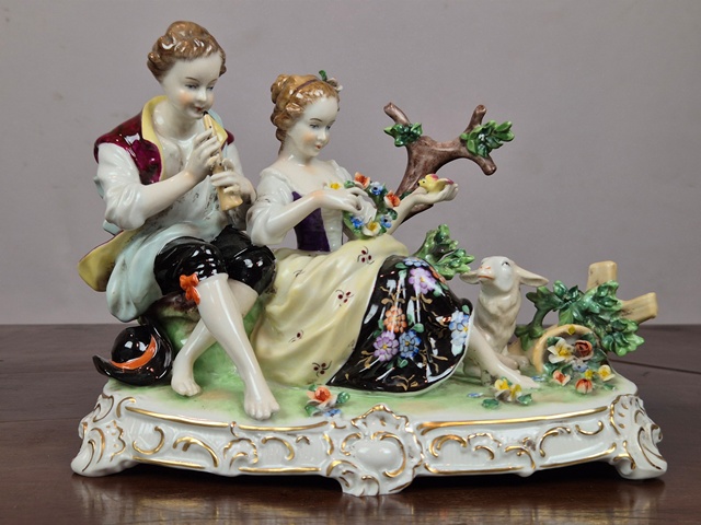 ANTICO GRUPPO IN PORCELLANA SEC.XIXdisponibile GRUPPO IN PORCELLANA RAFFIGURANTE SCENA GALANTE IN ABITI SETTECENTESCHI CON CAPRETTA,FIRMATO SUL FONDO CON "N" CORONATA IN BLU DI CAPODIMONTE. EPOCA FINE SEC.XIX ALTEZZA:13,5 CM LUNGHEZZA:13 CM PROFONDITA':8 CM IN BUONE CONDIZIONI CON PICCOLI SEGNI DEL TEMPO PASSATO.