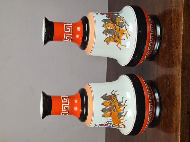 PARTICOLARE COPPIA DI VASI IN PORCELLANA SEC.XXdisponibile COPPIA DI VASI IN PORCELLANA DECORATI A MOTIVI DI GRECHE,CARRI E CAVALLI. EPOCA SEC,XX ALTEZZA:30 CM IN BUONE CONDIZIONI CON LIEVI SEGNI DEL TEMPO PASSATO. € 300,00 |