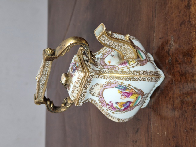 ANTICA TEIERA IN PORCELLANA MAISSEN SEC,XVIIIdisponibile TEIERA IN PORCELLANA DECORATA IN ORO E DIPINTA A MOTIVI DI SCENE QUOTIDIANE,TAPPO CON CATENELLA E PRESA IN METALLO DORATO E PORCELLANA. MARCATA SUL FONDO CON SPADE INCROCIATE IN BLU, MAISSEN. ALTEZZA:12,5 CM EPOCA SEC.XVIII-XIX PICCOLI RESTAURI COME DA FOTO. € 800,00 |