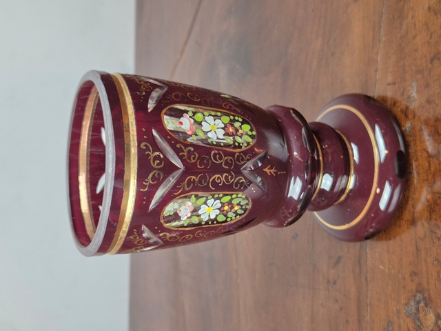 ANTICO CALICE BOEMIA SEC.XXdisponibile CALICE IN CRISTALLO DI BOEMIA DECORATO IN ORO CON RISERVE IN ROSSO RUBINO,MOLATO A MOTIVI FLOREALI. ALTEZZA:12.5 CM DIAMETRO:7,5 CM EPOCA SEC.XX