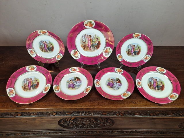 SERVIZIO PIATTI DA DOLCE IN PORCELLANA SEC.XXdisponibile SERVIZIO DA DOLCE COMPOSTO DA SEI PIATTI IN PORCELLANA DECORATA IN ORO A MOTIVI DI FESTONI E FRUTTA,CENTRALE CON SCENE NEOCLASSICHE. MARCATA SUL FONDO BAVARIA EPOCA META' SEC.XX € 120,00 |