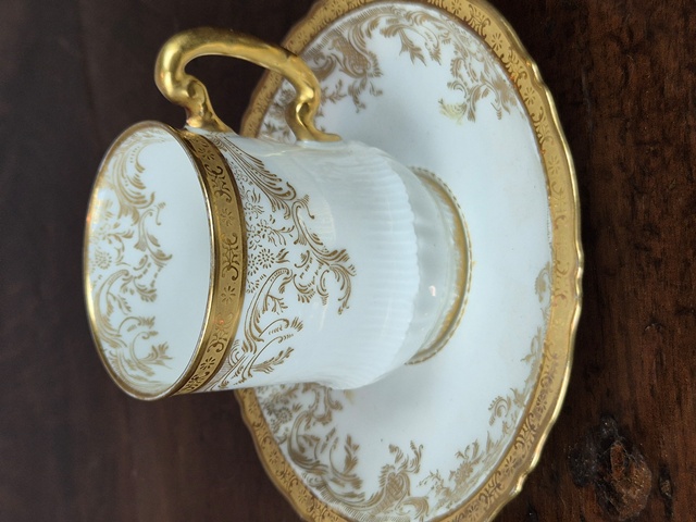 TAZZINA IN PORCELLANA LIMOGES SEC.XXdisponibile TAZZINA CON PIATTINO IN PORCELLANA DIPINTA E DECORATA IN ORO ZECCHINO. FIRMATA SUL FONDO THEODORE HAVILAND LIMOGES FRANCE EPOCA PRIMA META' SEC.XX ALTEZZA:7,5 CM DIAMETRO PIATTINO:13 CM IN OTTIME CONDIZIONI. € 25,00 |